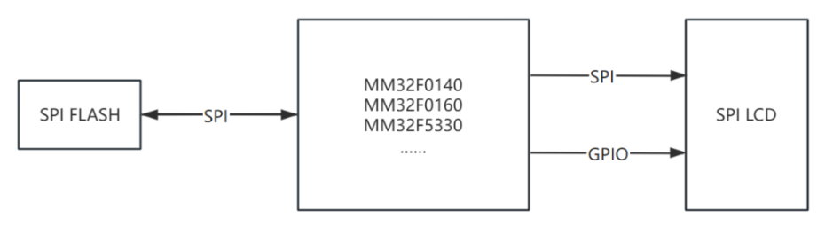 靈動微推出的SPI LCD顯示參考方案,通過SPI接口讀取外部SPI FLASH存儲芯片中存儲的字體、圖片等數據資源,再通過另外一路SPI驅動SPI LCD彩屏顯示。對于不同尺寸、不同分辨率的 SPI LCD 彩屏,客戶可以選擇靈動微電子不同規格的MCU來實現刷屏效果,硬件設計框圖如下所示: