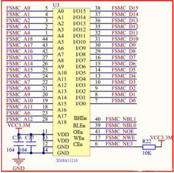 圖中A0~18為地址線,總共19根地址線(即2^19=512K,1K=1024);DQ0~15為數據線,總共16根數據線。CEn是芯片使能信號,低電平有效;OEn是輸出使能信號,低電平有效;WEn是寫使能信號,低電平有效;BLEn和BHEn分別是高字節控制和低字節控制信號;
