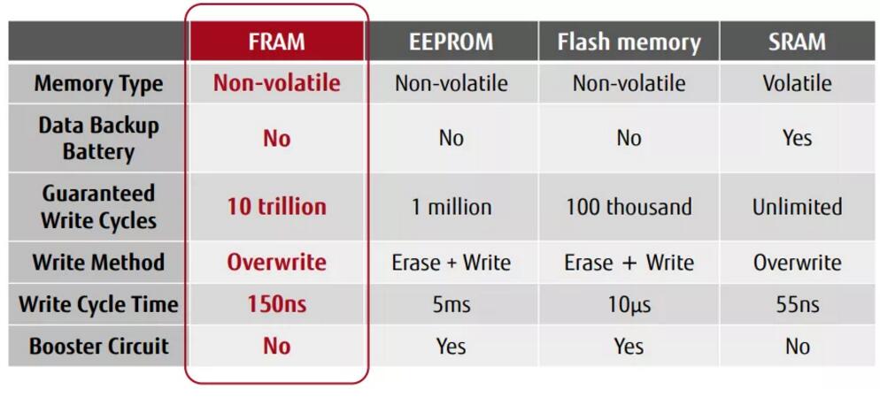 富士通FRAM主要具備三大優勢:高讀寫入耐久性、高速寫入以及低功耗,這是絕大多數同類型存儲器無法比擬的。比如FRAM寫入次數壽命高達10萬億次,而EEPROM僅有百萬次(10^6)。富士通FRAM寫入數據可在150ns內完成,速度約為EEPROM的1/30,000。寫入一個字節數據的功耗僅為150nJ,約為EEPROM的1/400,在電池供電應用中具有巨大的優勢。