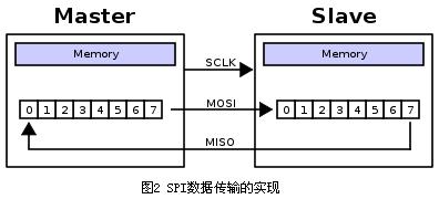 這是通過移位寄存器來實現(xiàn)的。如圖2所示,主機和從機各有一個移位寄存器,且二者連接成環(huán)。隨著時鐘脈沖,數(shù)據(jù)按照從高位到低位的方式依次移出主機寄存器和從機寄存器,并且依次移入從機寄存器和主機寄存器。當(dāng)寄存器中的內(nèi)容全部移出時,相當(dāng)于完成了兩個寄存器內(nèi)容的交換。